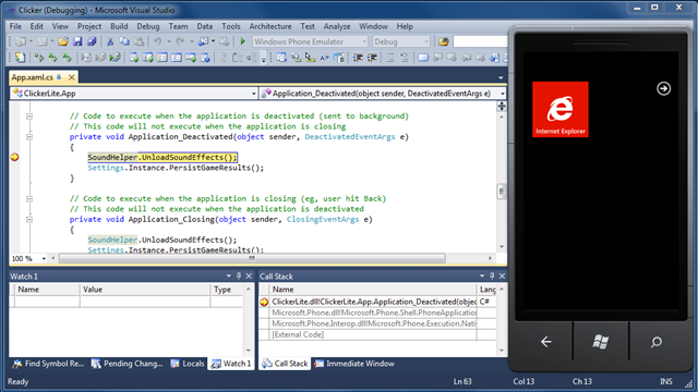 The debugger shows that the application is still running even though the application is no longer visible on the device. By using the back key on the device, it is possible to return to the application and to continue debugging it. However, if you start the application again on the device (so not using the back key), the debugger terminates. This means that a brand new instance of the application was started. Inside an application, it is possible to distinguish between a new instance being started and resurrection from being tombstoned by acting on the Launching or Activated events respectively. In both cases, the constructor of the page that becomes visible will be executed. More information about the application life cycle of a Windows Phone application can be found in this excellent series of blog entries by Yochay Kiriaty.
