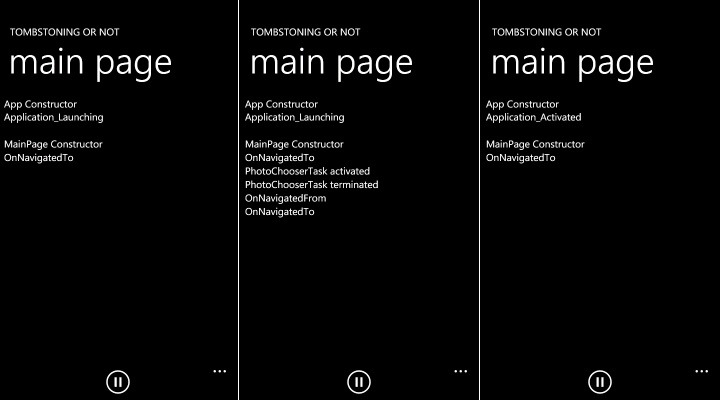 In the left screen you can see the application immediately after the main page became visible. In the center screen you see the result of clicking the pause button, after which a PhotoChooserTask was activated and closed again. What you can see is that there is no Application_Deactivated / Application_Activated combination. You can also see that no constructor is called after returning from the PhotoChooserTask. In other words, the application is not tombstoned while the PhotoChooserTask is active. Finally, the right screen shows how the application returns from being tombstoned. In this case constructors are called and Application_Activated is raised.
