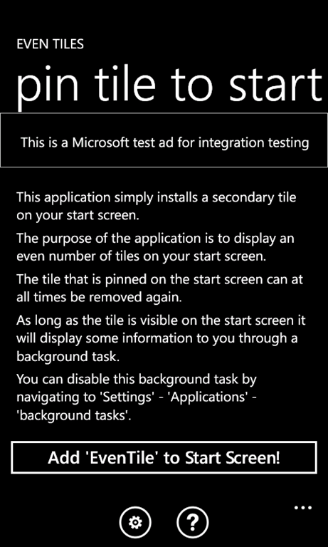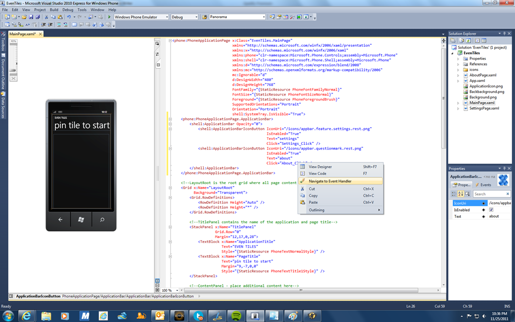What you can see here is Expression Blend showing the MainPage of our EvenTiles application. You can also see how to select an ApplicationBarIcon in the collection of ApplicationBarIcon buttons. Besides concentrating on creating a (static) UI for a Windows Phone application, Expression Blend is also a fantastic tool to create different visual states and animations. We are still in the early stages of application development in this series, but more in depth usage of Expression Blend will definitely follow later on. For now we will just add a little bit of functionality to our application. Using Expression Blend, two new pages have been added to the project, a Settings Page and an About Page. Both these pages only contain a filled title section. Right now, the only functionality that will be added to the application is code to navigate to each of the two empty pages when the corresponding ApplicationBar buttons are clicked. The following code snippet shows the ApplicationBar that was created with Expression Blend in XAML, and already includes Click event handlers: