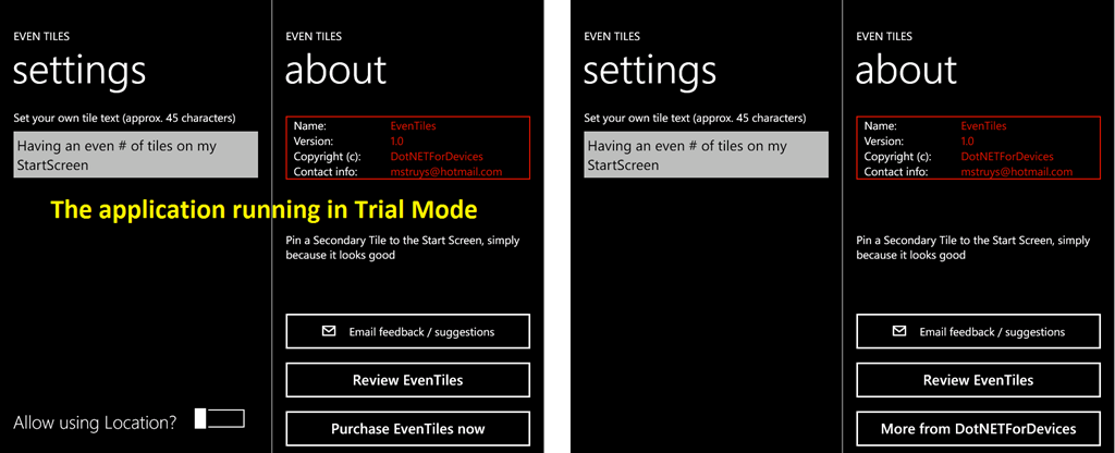 Let’s assume that EvenTile has two different modes of operation, implemented through Trial Mode. In Trial Mode, EvenTiles is fully functional without restrictions, however, the application will display ads on the main page (adding the actual advertisements to EvenTiles will be covered later in this series). As soon as users purchase EvenTiles, advertisements will be disabled. In trial mode, the application also contains functionality to retrieve location information in order to receive localized advertisements, although the user can disable location retrieval through the Settings Page of the application. However, if a user purchases the application, location information will not be retrieved and it does not make sense to have a toggle switch in the Settings Page to enable / disable location retrieval. Finally, if the user runs EvenTiles in trial mode, they have the option to purchase the application from within the application’s About Page. Of course, this option is only available in trial mode, if the application is already purchases, the About Page allows a user to display more applications that were published by DotNETForDevices.