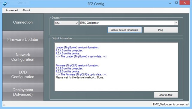 Once all components are connected to the motherboard, it is time to connect the USB cable to the development machine. After installing necessary drivers on the development machine, it is now possible to select the FEZ Spider Board as target device inside Visual Studio. After doing that, your application will be deployed automatically to the target device when you start debugging. You will also have a full debugging experience when you deploy your application in this way to the target. However, this will only work if you have the right version of the boot loader and the FEZ ConfigTinyCLR present on the device. If you have an older version of the firmware on the device, Visual Studio cannot deploy your application and gives an error message instead. In my situation I had the right loader, but an older version of the TinyCLR. To update to the latest version of the TinyCLR, you can use the application FEZ Config, which is installed together with the Vendor SDK you installed previously. FEZ Config can be found under C:\Program Files (x86)\GHI Electronics\GHI FEZ Config for a default installation.